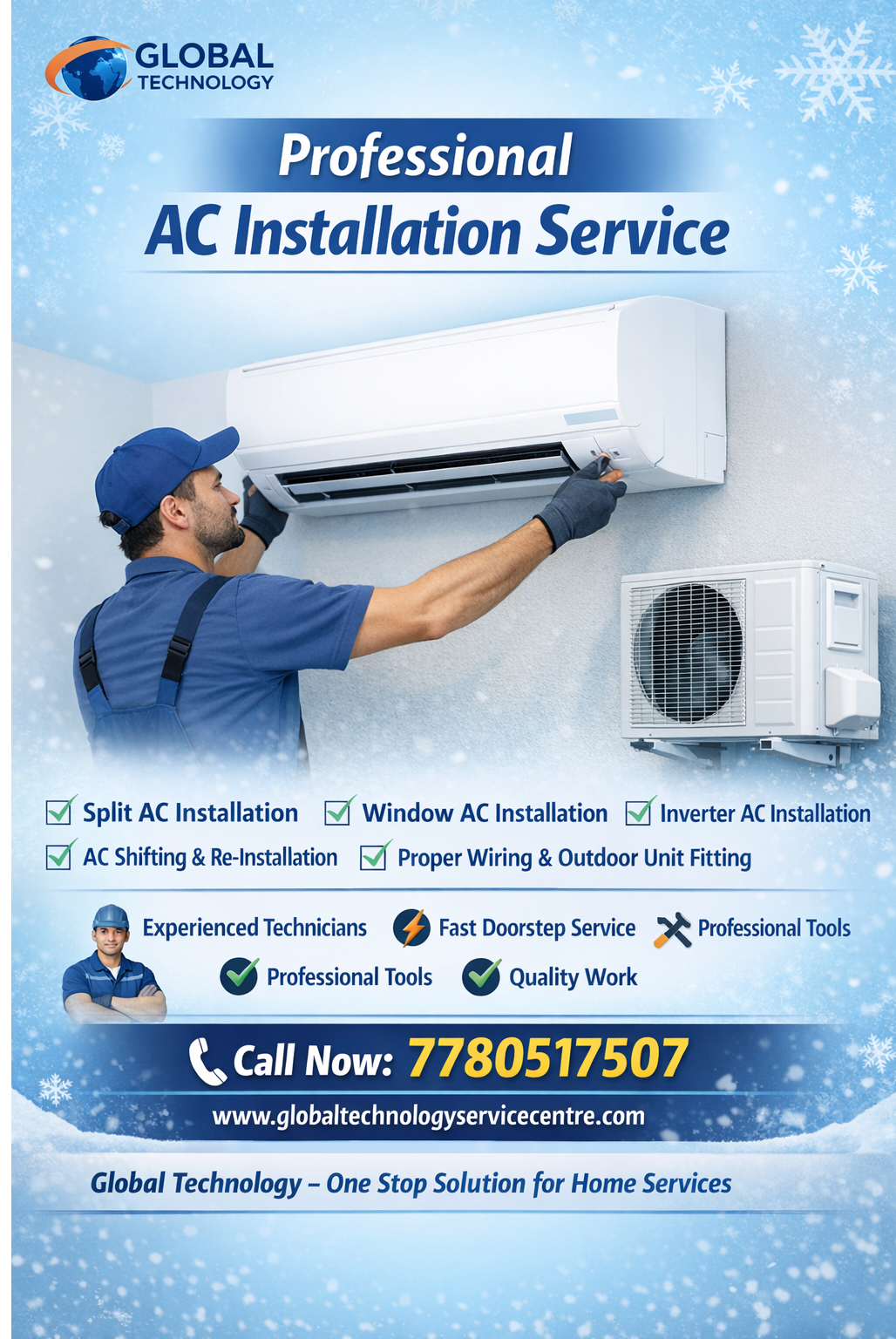 Global Technology Service Centre provides professional and reliable AC installation services for all brands and models. Our expert technicians ensure safe, efficient, and long-lasting installation so your air conditioner works at its best performance. Whether it is a Split AC, Window AC, or Inverter AC, our team delivers 5-star rated installation service across Hyderabad. Installing an air conditioner correctly is very important for cooling efficiency, energy saving, and long life of the AC unit. At Global Technology, we follow professional installation standards including proper wall mounting, copper pipe connection, drainage setup, electrical wiring, and testing. π Call Now: 7780517507 π Website: www.globaltechnology2814.com βοΈ Why Choose Global Technology for AC Installation? β Professional & experienced technicians β Installation for all AC brands (LG, Samsung, Daikin, Voltas, Panasonic, Blue Star, Hitachi & more) β Proper vacuuming and gas pressure checking β Safe electrical connection and earthing β Fast same-day installation service β Affordable service charges β 1-Month Service Warranty Our technicians understand the importance of correct AC placement and installation angle. Improper installation can lead to gas leakage, water leakage, poor cooling, and higher electricity bills. Thatβs why our team follows industry best practices for every installation. π§ Types of AC Installation We Provide β Split AC Installation β Window AC Installation β Inverter AC Installation β Cassette AC Installation β Tower AC Installation β Commercial AC Installation β New AC Installation β Re-installation / AC shifting We also provide extra services like copper pipe extension, outdoor unit stand fitting, ducting work, and drainage pipe installation. π 5-Star Customer Satisfaction At Global Technology, customer satisfaction is our top priority. Our technicians arrive on time, complete the work professionally, and ensure the AC runs smoothly before leaving. This dedication has helped us earn excellent customer reviews and 5-star ratings. Our service process includes: 1οΈβ£ Site inspection 2οΈβ£ Proper indoor unit mounting 3οΈβ£ Outdoor unit installation 4οΈβ£ Copper pipe connection 5οΈβ£ Electrical wiring connection 6οΈβ£ Drain pipe setup 7οΈβ£ Final cooling performance test This ensures your AC works efficiently and safely from day one. π AC Installation for Homes & Offices We provide installation services for: β Apartments β Villas β Individual houses β Offices β Shops β Commercial buildings No matter the location, Global Technology technicians ensure clean and professional installation with proper tools and equipment. π SEO Keywords for Google Ranking AC installation service Hyderabad best AC installation near me split AC installation service professional AC installation technicians window AC installation service AC fitting service Hyderabad AC installation experts air conditioner installation service near me Using these professional techniques helps your AC run cooler, quieter, and more energy-efficient. π Book Your AC Installation Today If you are looking for trusted and affordable AC installation service, choose Global Technology Service Centre. Our experienced technicians will ensure your air conditioner is installed perfectly for maximum cooling and performance. π Call / WhatsApp: 7780517507 π Website: www.globaltechnology2814.com βοΈ Global Technology β Your Trusted Home Service Partner